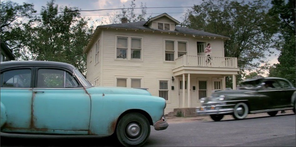 looks like a maroon '65 Buick convertible on far left and '64 Studebaker Wagonaire at far left foreground. Remember, this scene is supposed to be set during JFK's 1960 presidential campaign. *tsk*tsk* |