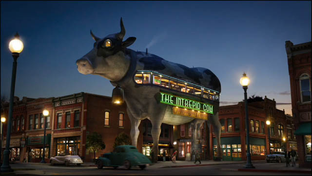 For some reason, the Pushing Daisies wiki won't load pics for me to post. This is a crappy B&W pic of the scene I am mentioning (the Intrepid Cow. It only appears once in the show). It is the white car outside the restaurant in the corner.![]() |