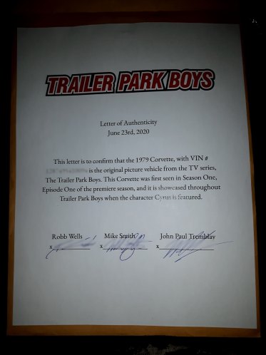 The red Corvette used in Trailer Park Boys by Cyrus is not a 1977 model. I know because I have a 1977 Vette and that is the last year of the indented rear window on the C-3s 1978 -1982 had that large glass wrap around rear window. I suspect it is a 78 or 79 model the last of that series had more spoilers and more accentuated fender work. |