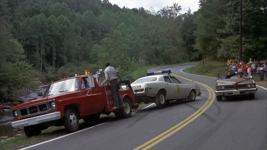 La voiture blanche remorquée par la dépanneuse est une Plymouth Fury de 1975-76. Et quant à la marron, ce n'est autre que celle du shérif Buford T. Justice en version "cabriolet"!!!! Lol!!! |