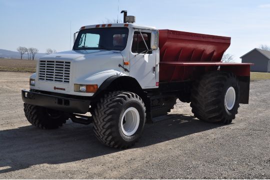 Looks like it has flotation tires; you see those on trucks intended for agricultural use, driving over cultivated fields, spreading fertilizer, etc.: Link to "cdn.globalauctionplatform.com" |