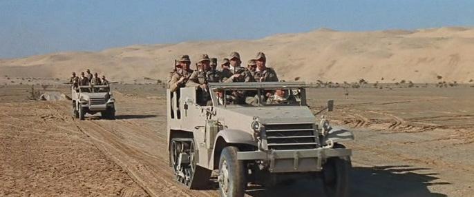 The lead vehicle in this picture is an M3, probably a later model as evidenced by the headlights mounted on the sides of the engine cover rather than the wing. It has been modified for the film by having cutouts in the sides and benches added to make it look like a German Hannomag, which is an altogether larger vehicle. However I think the effect is pleasing. As well as Raid on Rommel this M3 also has a very brief appearance in Tora Tora Tora, this time painted green and in American colours. The second vehicle is an M2. It seems to be in standard specification. -- Last edit: 2020-05-02 19:44:39 |