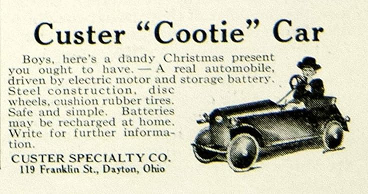 Jale ![]() | "According to the Standard Catalog: "Custer Electric – Dayton, Ohio – (1920-42) – L. Luzern Custer purportedly built an experimental electric car in 1898, but it was not until 1920 that he began his Custer Specialty Company in Dayton for the production of electric vehicles. The Custer was built as a Cootie (children's car), Cabbie (miniature railroad). Chair (automotive wheelchair), Carrier (factory truck) and Coupe (two-passenger city car). Of all varieties, the most significant in production was the automotive wheelchair, which was doubtless to Luzern Custer's personal satisfaction because he happened to be an invalid himself. The Cootie was perhaps the second most produced of the Custer vehicles. As for the Coupe, it weighed 550 pounds, was not much longer than it was high (78 inches versus 62), was rather cute, and might have been a marvelous proposition for crowded metropolitan areas except for one thing; its cruising speed was eight miles per hour. The Custer Specialty Company was in business a long time in Dayton (into the 1960s), but no more than a handful (and possibly only one) of the Coupes was ever built."" from: Link to "forums.aaca.org" The Cootie could be the model name in fact... |